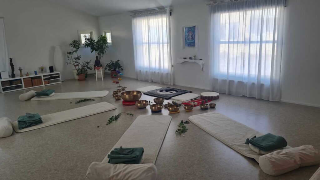 Varje pass omsluts av ljud och vibrationer. Klangskålar, trumma och andetagets rytm skapar ett ljudlandskap som fördjupar vilan och öppnar dörren till medveten närvaro.